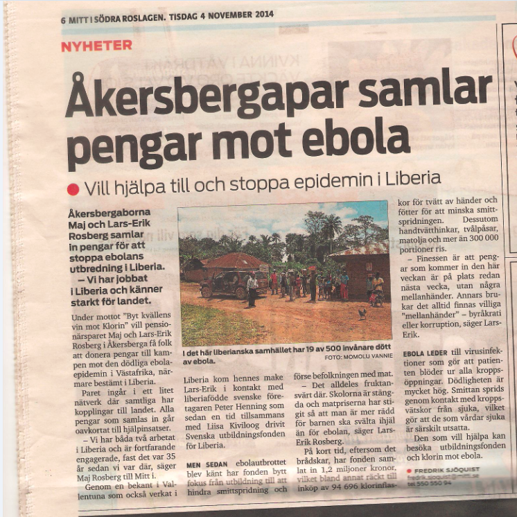 Maj och Lars-Erik Rosberg har varit verksamma på YMCA i Liberia på 70-talet. De har varit med själva med ett generöst stöd i satsningen mot Ebolan. De har uppmuntrat vänner, bekanta och medlemmar i en annan ideell förening att stötta. Nu har de t o m nått ut i hela Waxholm och Österåkers kommun i lokaltidningen. Det är precis ett sånt stöd som ger snabb hjälp och ger möjlighet att visa bilder från stöd till Liberia.