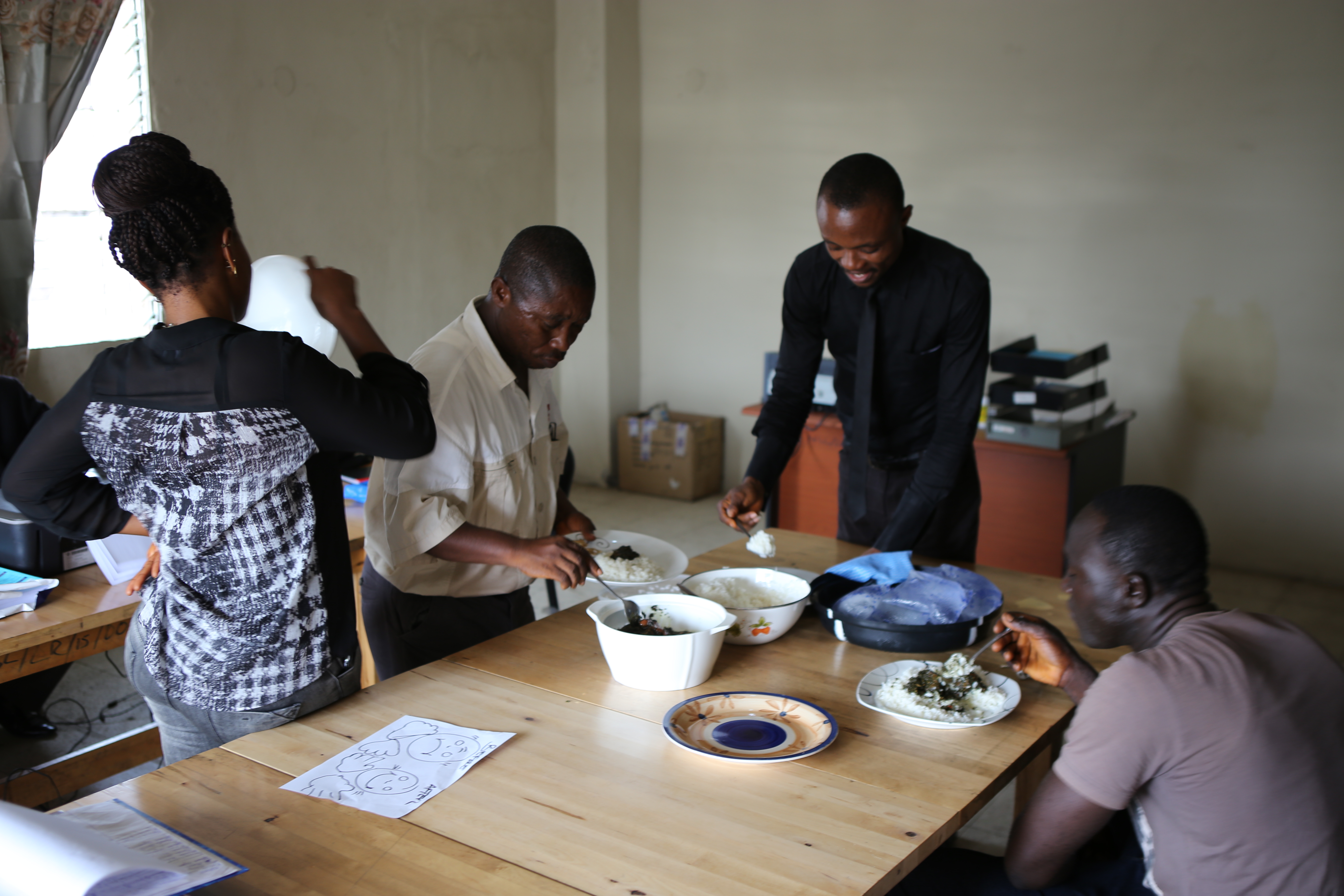 Efter dagen på skolan åkte vi till kontoret, summerade dagen och delade på ris med småfisk och cassava leaves, med rent vatten i påse. Gott!! Imorgon bär det av i gryningen till två skolor i ett annat län (Grand Bassa).