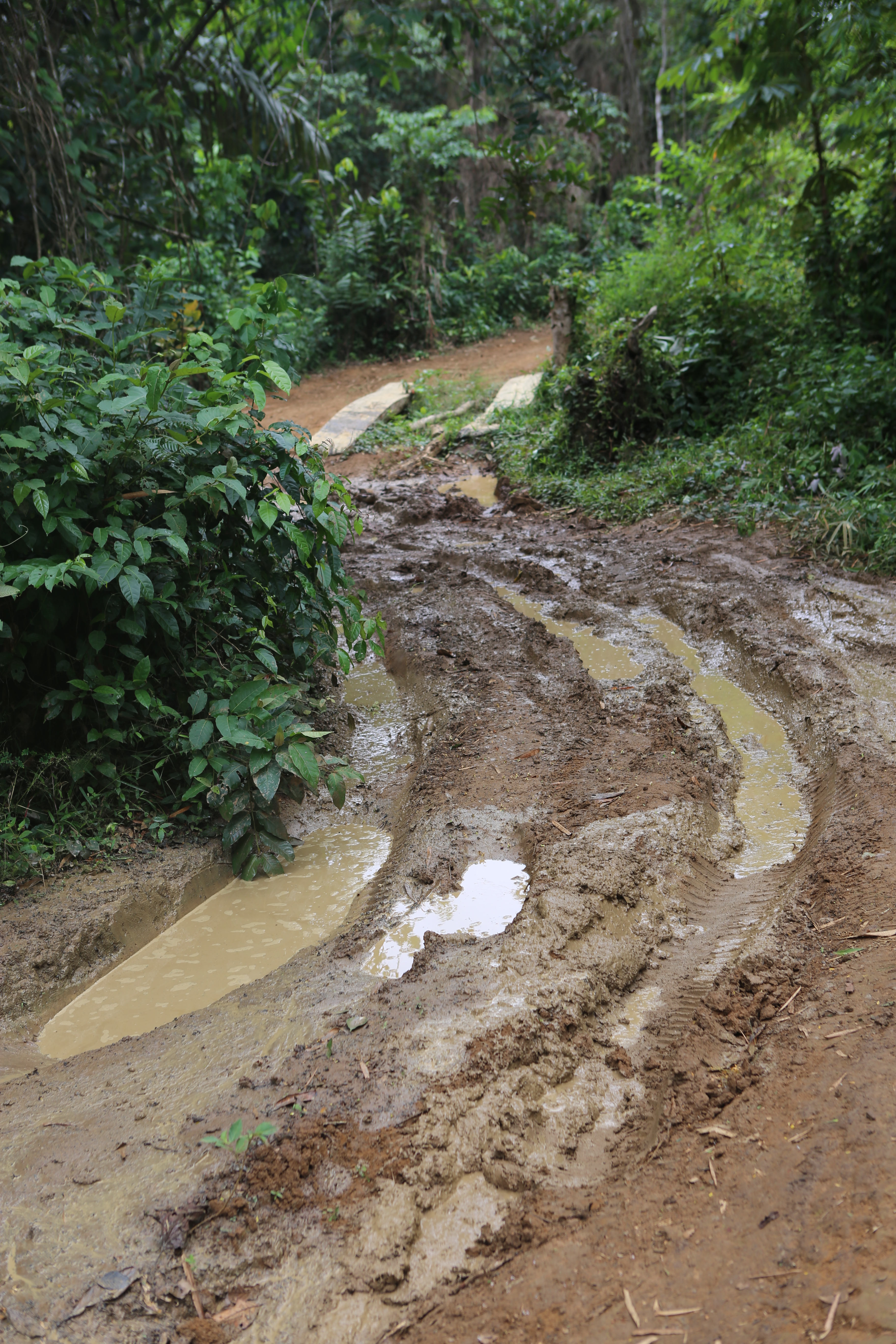 Byar som har fantastiska förutsättningar med aktivt jordbruk som ris, jordnötter, kakao, kaffe, palmolja etc. Just det – men mer eller mindre omöjligt att transportera ut det på ett vettigt sätt. Här nådde vi nu en snitthastighet med 13km/h och då bromsar man aldrig i kurvorna, man ”vet” att det inte kommer nån annan. Men man tutar. Att åka bil här under regnsäsongens månader går inte alls.