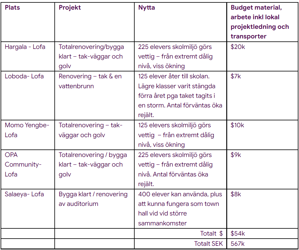 Alla projekten är skolbyggnader, som är i väldigt dåligt skick eller oanvändbara, som med rimliga insatser kan göras väl fungerande igen. Det kommer förbättra situationen för ca 1100 elever årligen och även öka antalet som går i skolan. Det är skolor som klarar sig i övrigt idag och där vi inte behöver stötta med drift efter insatserna.