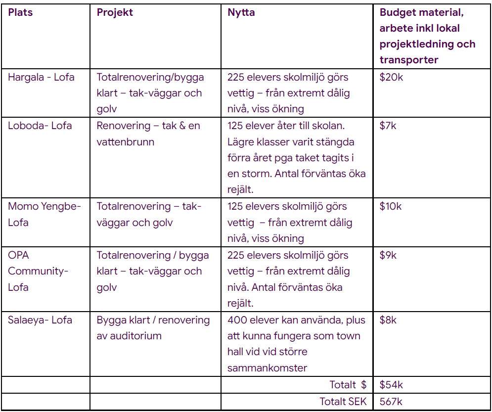 Tabellen nedan summerar fem projekt, varav fyra är finansierade tack vare ett antal givare som stöttar mycket och regelbundet. Väldigt stort tack!! Underliggande budgetar är som alltid på en detaljnivå ner till kostnader för spik.
