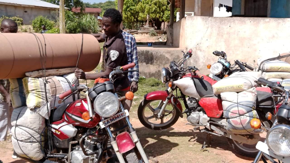 Till och med cementsäckar tas på motorcyklar för att kunna nå bygget. Photo: Joseph Jomah