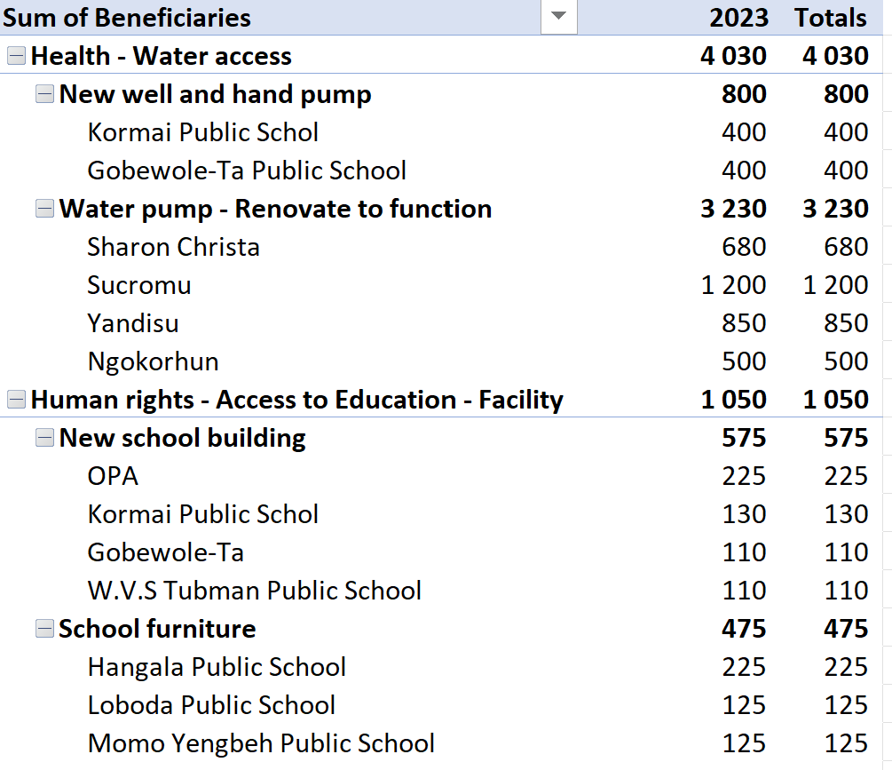 Under 2023 har redan fyra skolor byggts (en var startad 2022), sex vattenbrunnar fixats och skolmöbler till tre skolor. Allt på tid och inom budget. Kostnaden per projekt är låg vilket ger så många projekt. Det är väldigt bra! Bilden nedan visar ungefärligt antal personer som kan dra nytta av dessa projekt i framtiden!