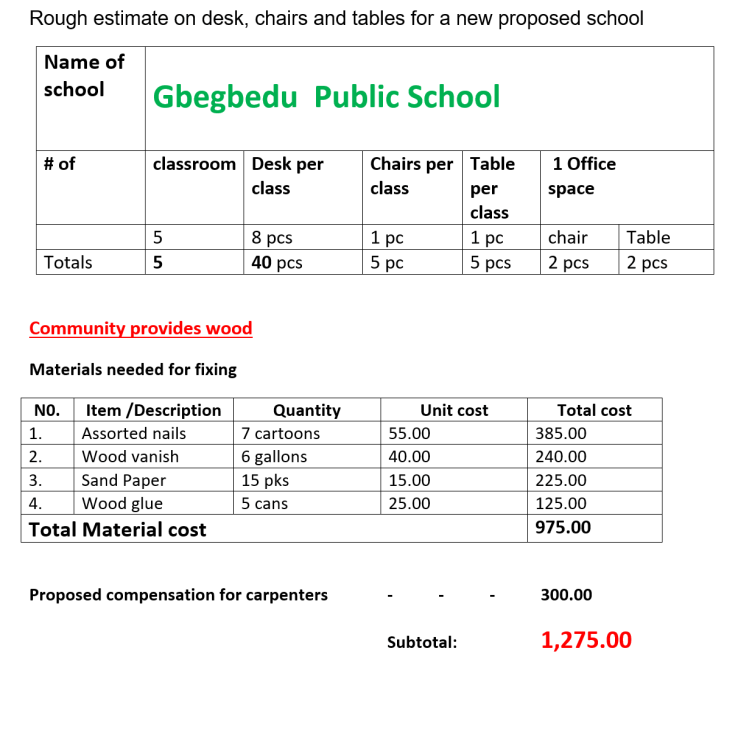 Så här ser budget ut för skolbänkarna som byggs lokalt. Byarna står för träplankorna.
