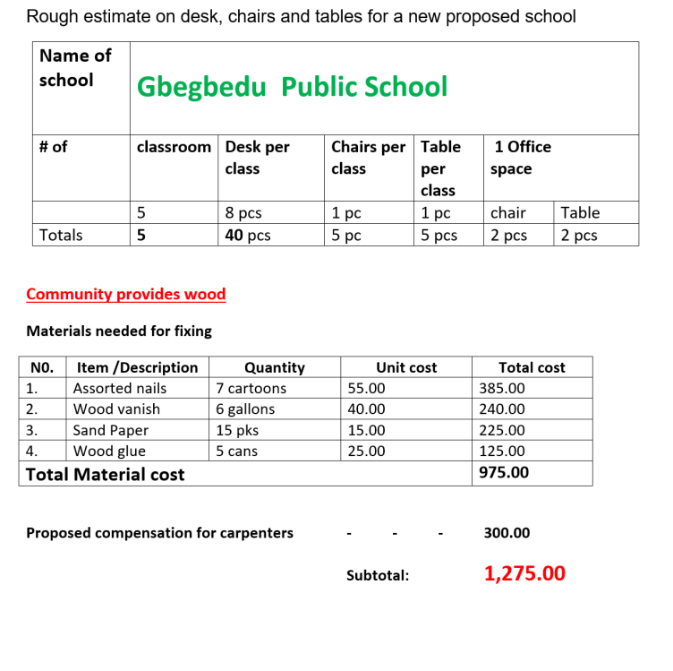 Så här ser budget ut för skolbänkarna som byggs lokalt. Byarna står för träplankorna.