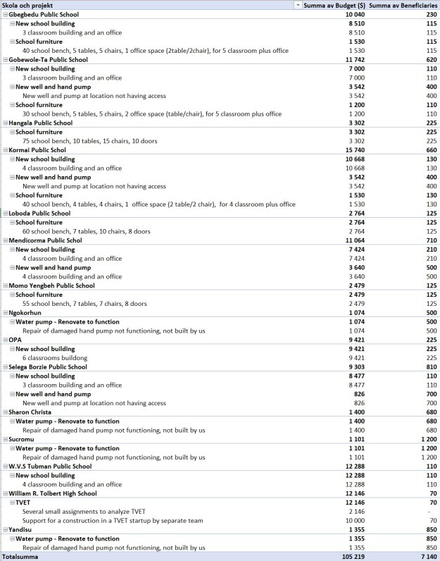Den kompletta summeringen finns i tabellen nedan tillsammans med bilder från året. I tabellen syns alla projekt, deras budget och effekten. Ett skolbyggnadsprojekt fixas inom 1-2 mån beroende på storlek. Och en vattenbrunn tar ca 6 veckor.