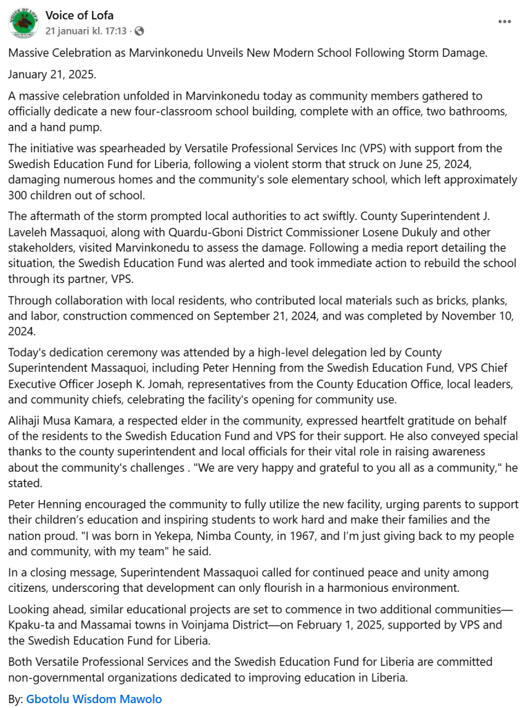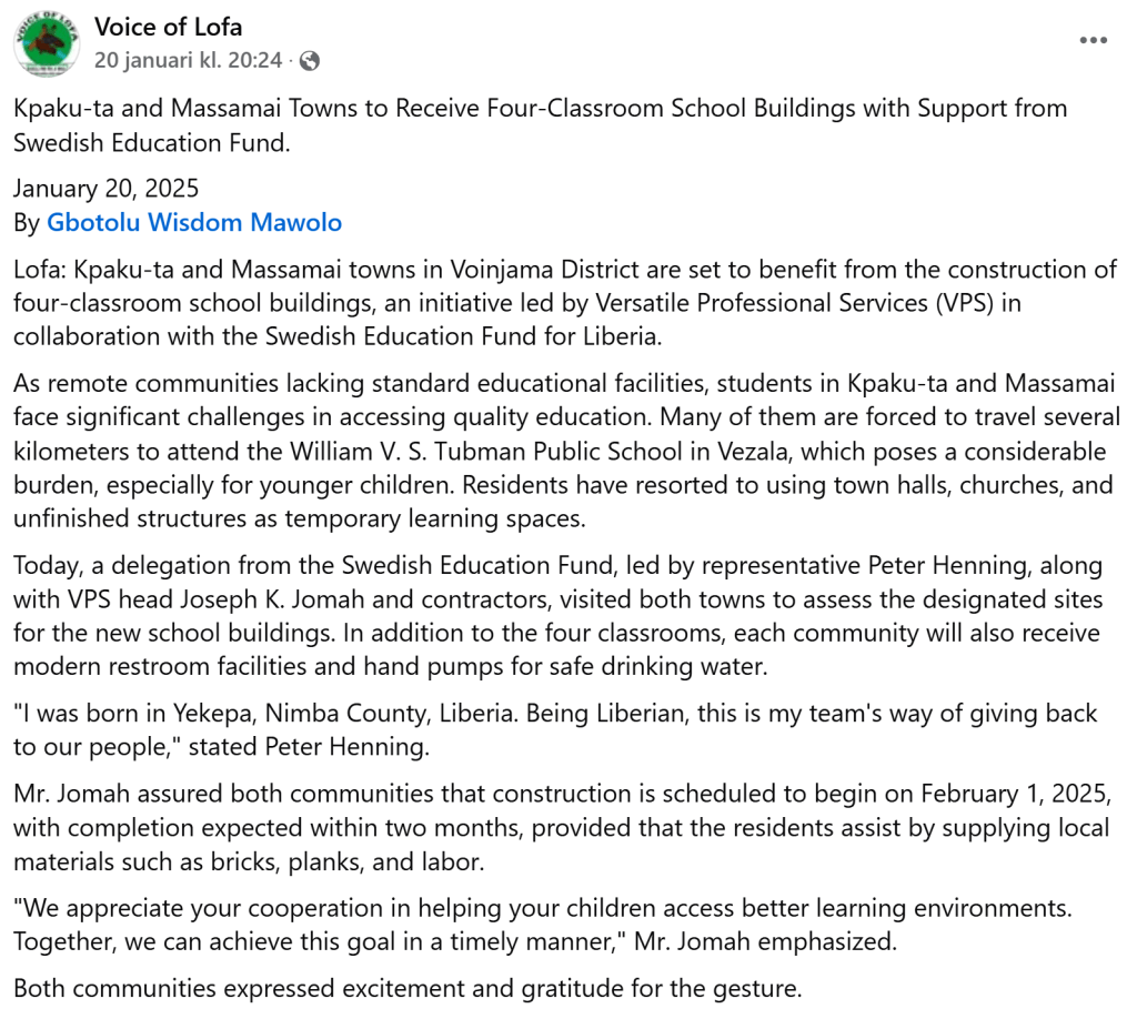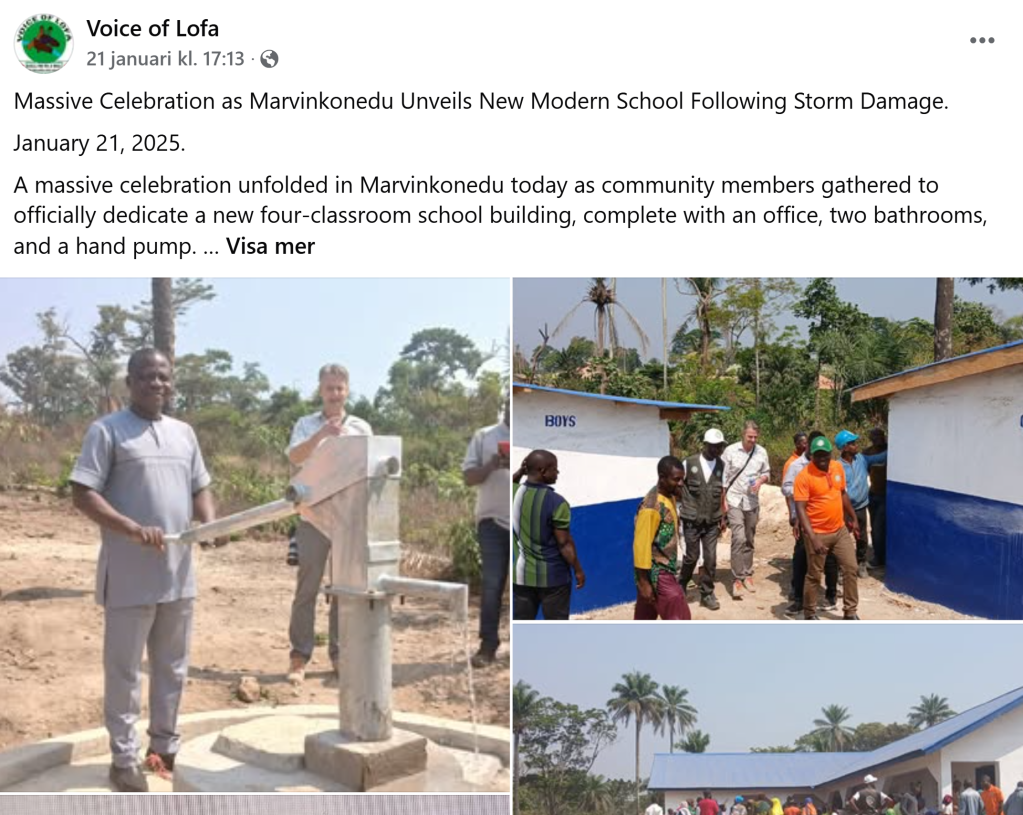 Nu har Peter Henning från Utbildningsfonden varit på besök och kollat (egenfinansierat). Efter nu 24 st skolbyggnationsprojekt och nästan lika många vattenbrunnar i Lofa känner man sig väldigt välkommen här. Berättartraditionen gör vårt arbete enklare, eftersom det gått bra. Allt bygger på att byarna gör allt de kan och vi stöttar med resten inkl hjälp av vår partner VPS.