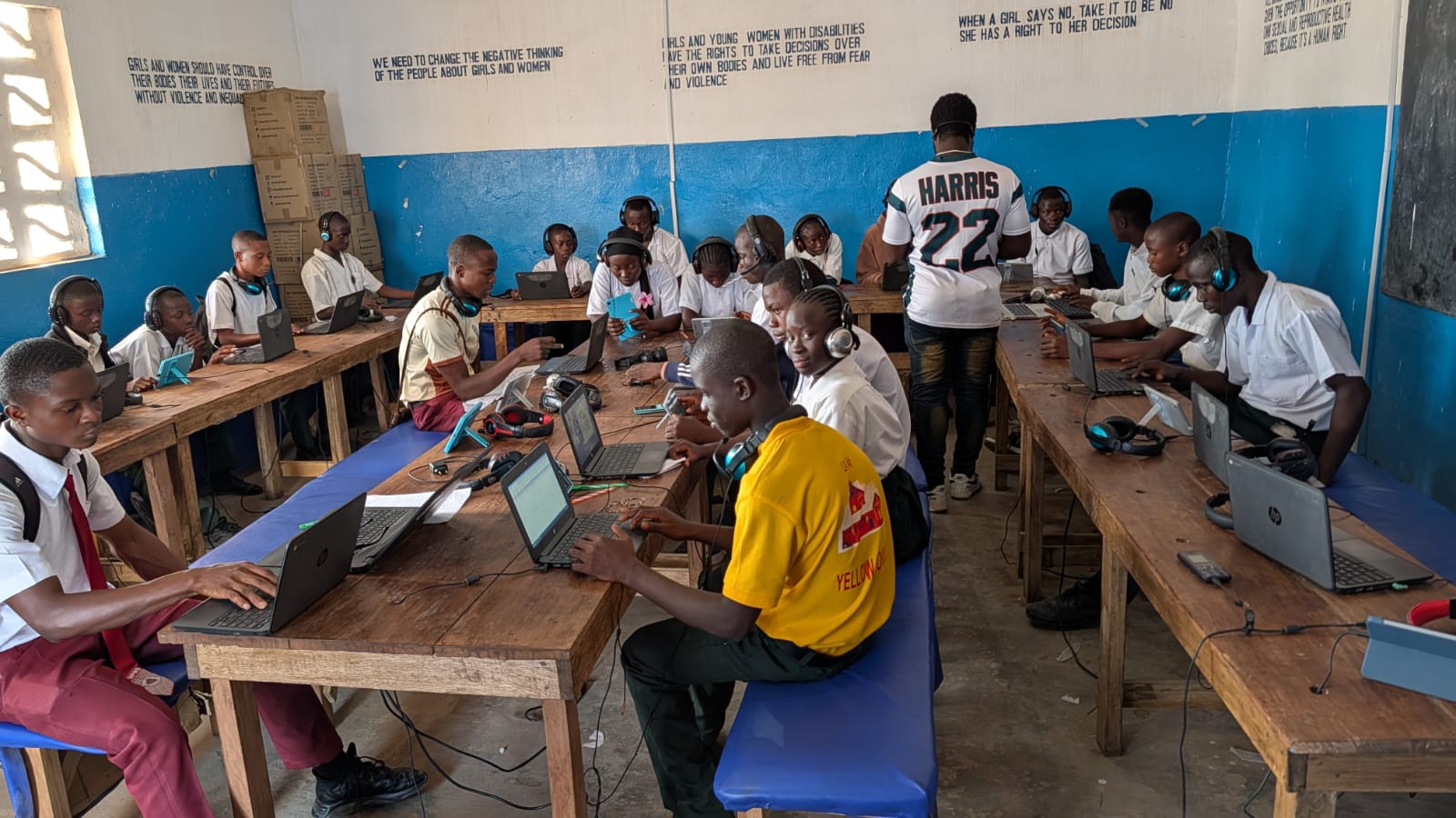 Vi besökte även det digitala labbet på Voinjama Public High School, där undervisningen nu är fullt igång. Tack vare den nya belysningen kan även andra klassrum användas för kvällsskola, som vi besökte under två kvällar. Där studerar bland annat elever som måste arbeta dagtid, men också ungdomar som vill förbättra sina skolresultat.