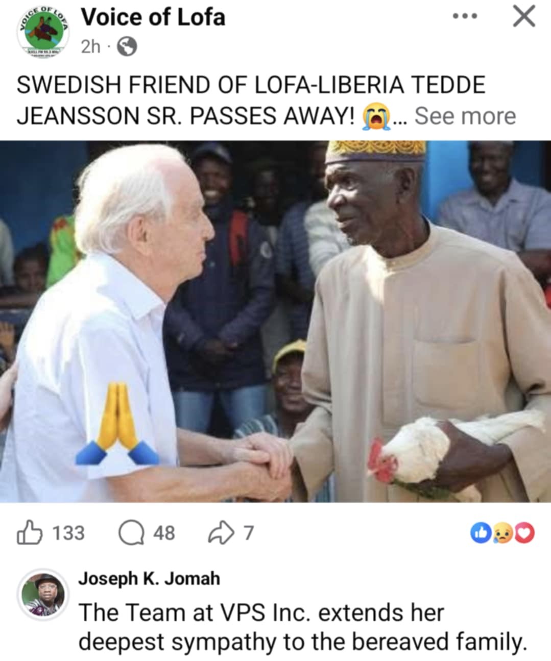 Tedde Jeansson Sr – vår vän, medgrundare, inspiratör och oerhört generösa kompis till Liberias unga – har gått vidare. Han hyllas idag lokalt i Lofa i media och på radio i olika språk – för allt han gjort.