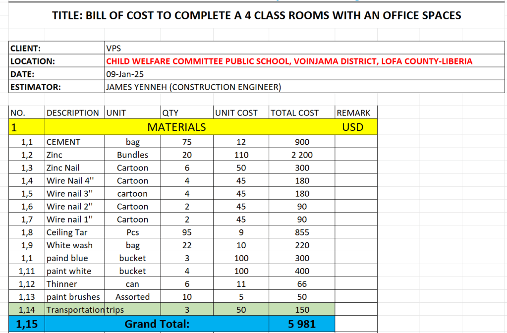 Och här är budgeten. Det tillkommer ca 15-20% för lokal projekt- och teknisk ledning på plats, som leder arbetet – där hela byn hjälper. Byn har även t ex ansvar för att stå för tegelstenar, sand och plankorna som behövs.