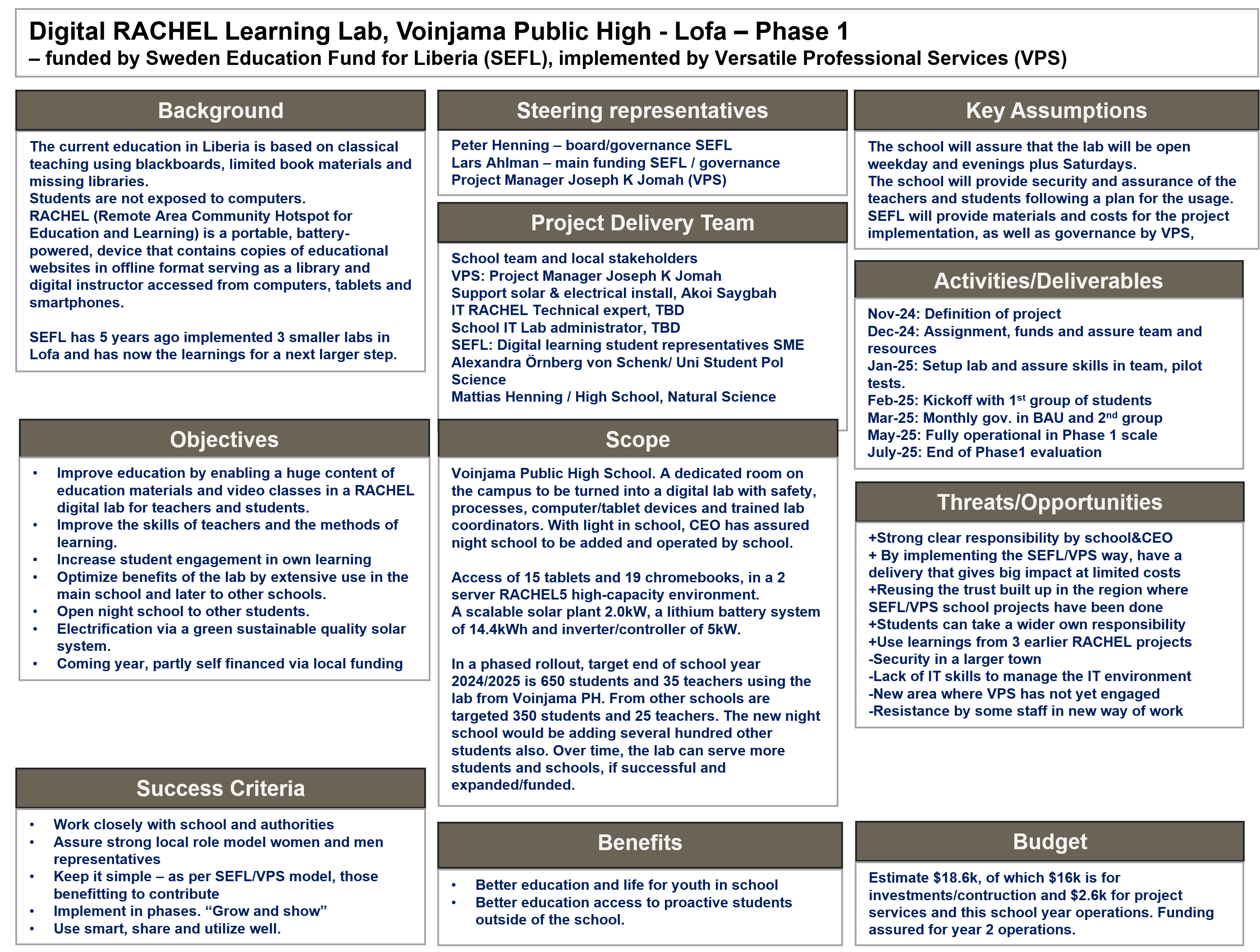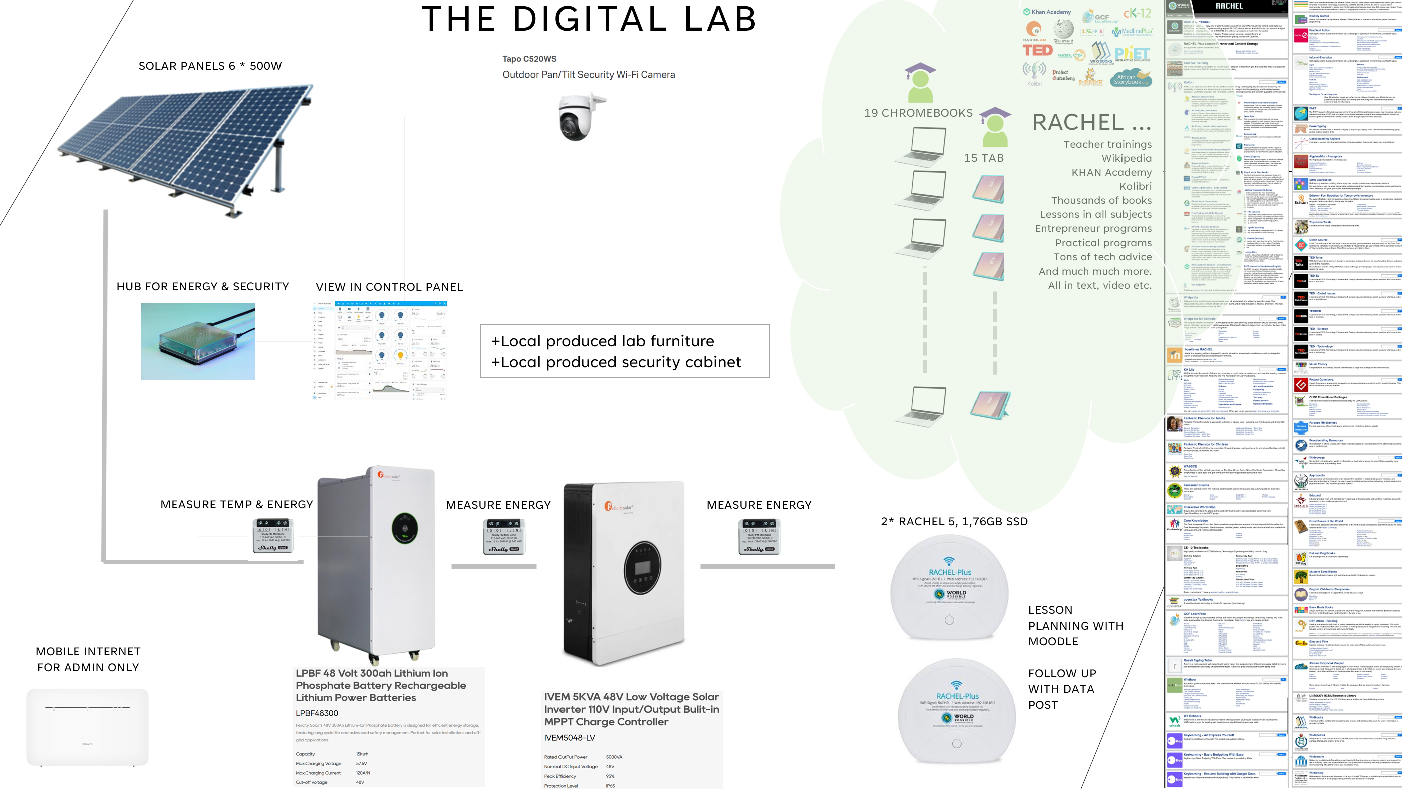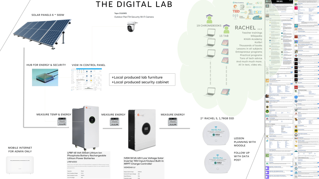– Vad är ett digitalt skolstöd? Ja, det är typ när en skola som inte ens har bibliotek, plötsligt får tillgång till tusentals böcker, tusentals timmar utbildningsfilm, Wikipedia, matteundervisning i Khan Academy och såna saker i alla ämnen. Vi implementerar lösningen RACHEL. Se exempel på innehållet här. Allt tillsammans med datorer och en bra solcellsanläggning. Och väldigt ivriga lärare och elever.
