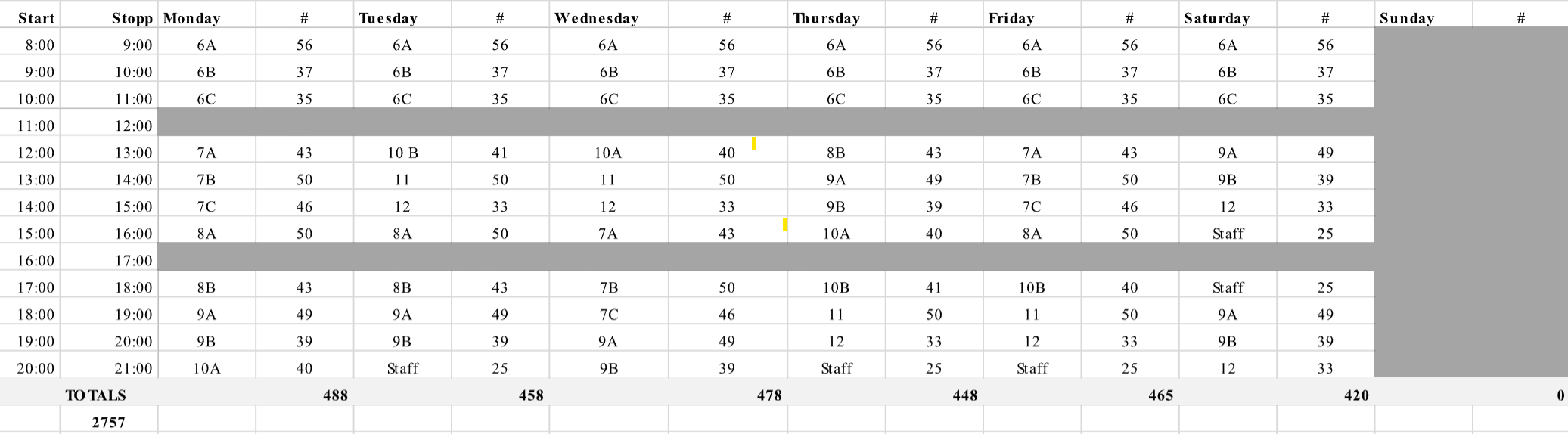 Nu är undervisningen i full gång och så här ser veckoschemat ut. Som ni ser är det väldigt hög användning av labbet i undervisningen! Det blir spännande att följa hur det går i vår! Eleverna är otroligt taggade. Totalt är det mer än 2700 ”elevlektioner” per vecka!! Klasserna har olika många tillfällen, eftersom just nu vissa behöver mer tid inför vissa stora prov etc. Så schemat kommer förändras löpande efter behoven.