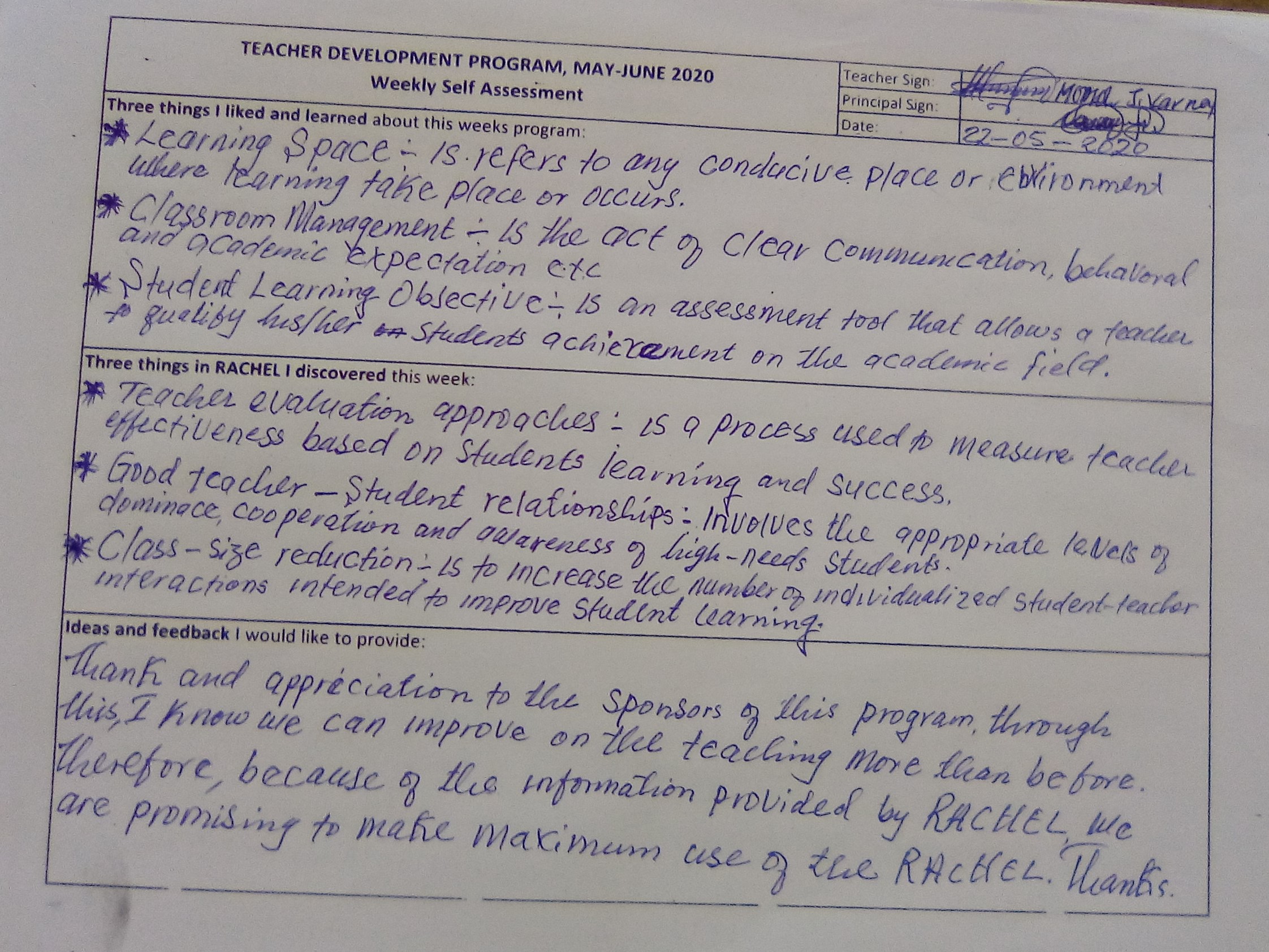 En egenutbildning av lärare har genomförts på tre stycken skolor i Lofa (Lukasu, F Bambayan och Koilahun). Lärarna följde ett eget veckoschema där de lär sig både att använda datoriserade undervisningen bättre med sina elever framåt, samtidigt som de även förbättrar sig i olika kunskapsområden. I de tomma skolorna satt nu lärare på säkert fysiskt avstånd och studerade istället. Programmet pågick i 8 veckor. Varje vecka gjordes en uppföljning och egenutvärdering av lärarna. Så här kan det se ut när en lärare summerar sin vecka. Från loggar kan resultaten även följas upp på distans för att se framdrift och kunna stötta.