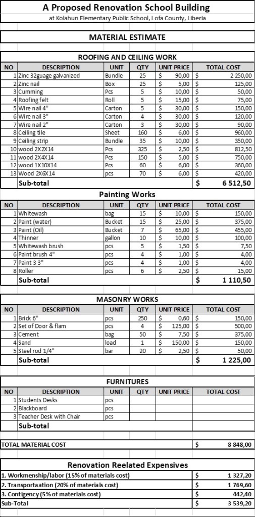 Kolahun Elementary Public School renoveras inkl takbyte och förbättringar inkl skolmaterial