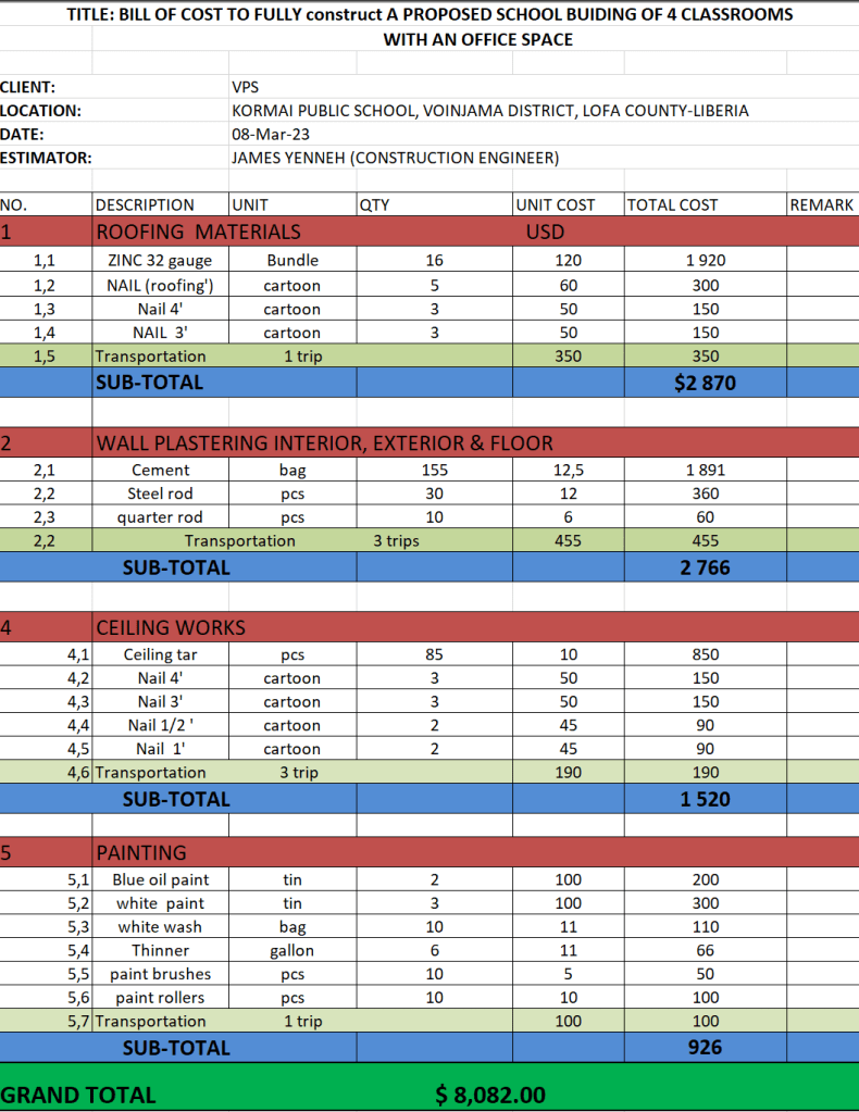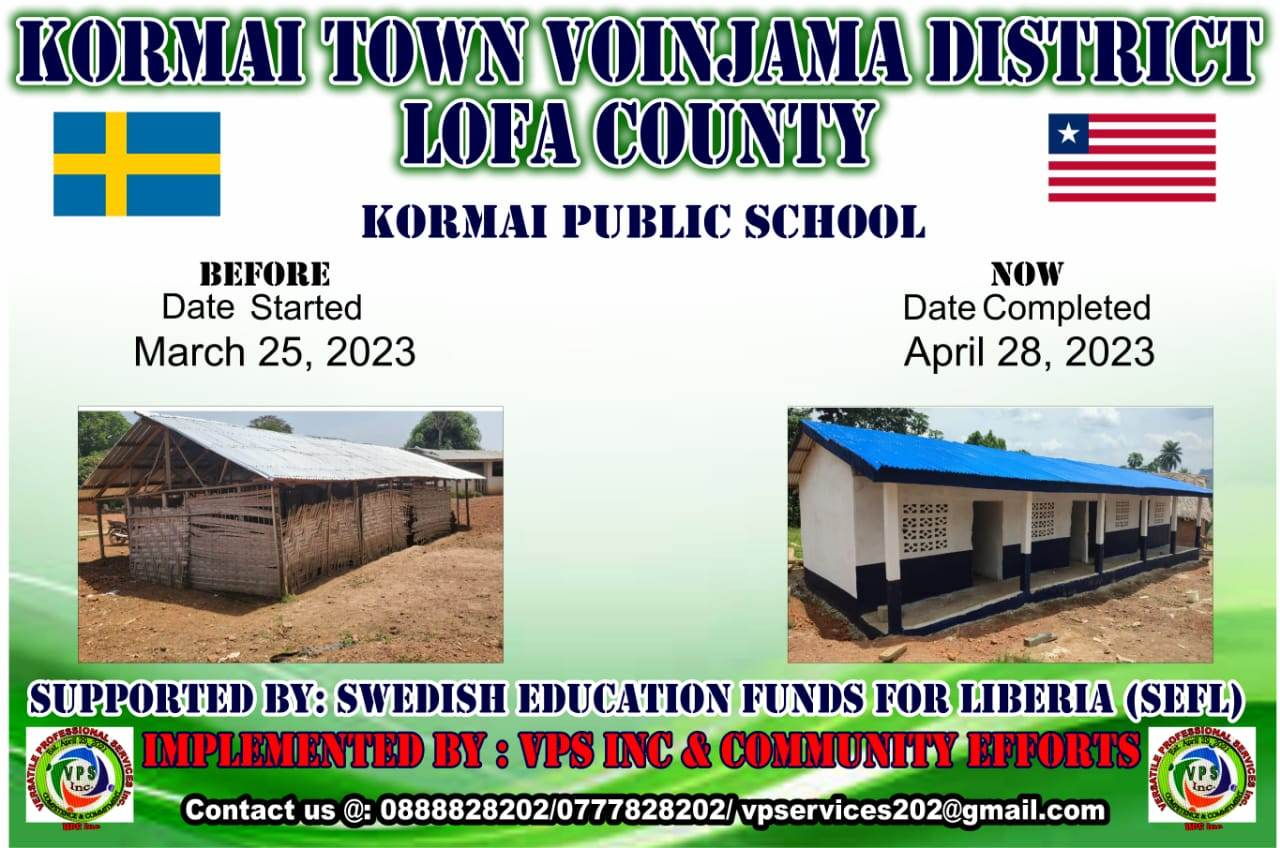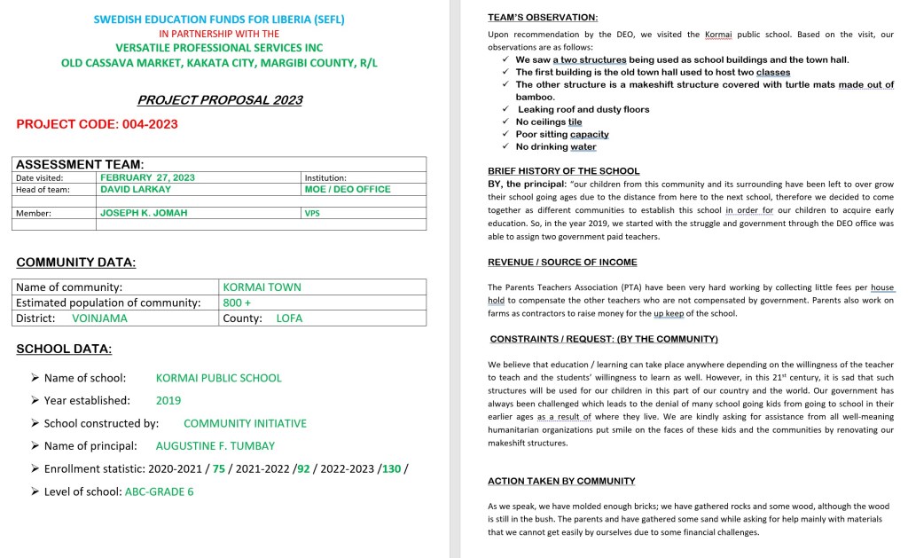 Under vintern 2023 har vi arbetat med att ta fram förslag på nästa projekt. Först ut blir ett par mindre skolor som är väldigt undermåliga idag. Projekten är i avlägsna platser i Lofa-regionen och i Voinjama-distriktet. De har tagits fram genom att lokala utbildningsansvariga (s k District Education Officers) i distrikten har föreslagit några av de absolut mest behövande skolorna de har i det distriktet. Vår lokala partner på plats har besökt dem, kollat bedömt och summerat. Vi ska bygga en ny skolbyggnad och gräva en vattenbrunn med handpump för att få rent vatten som saknas idag.