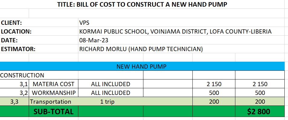 Budget enl nedan för att bygga skola och möjliggöra rent vatten med en brunn och handpump. Ca 15% tillkommer för lokala projekt- och tekniska ledningen