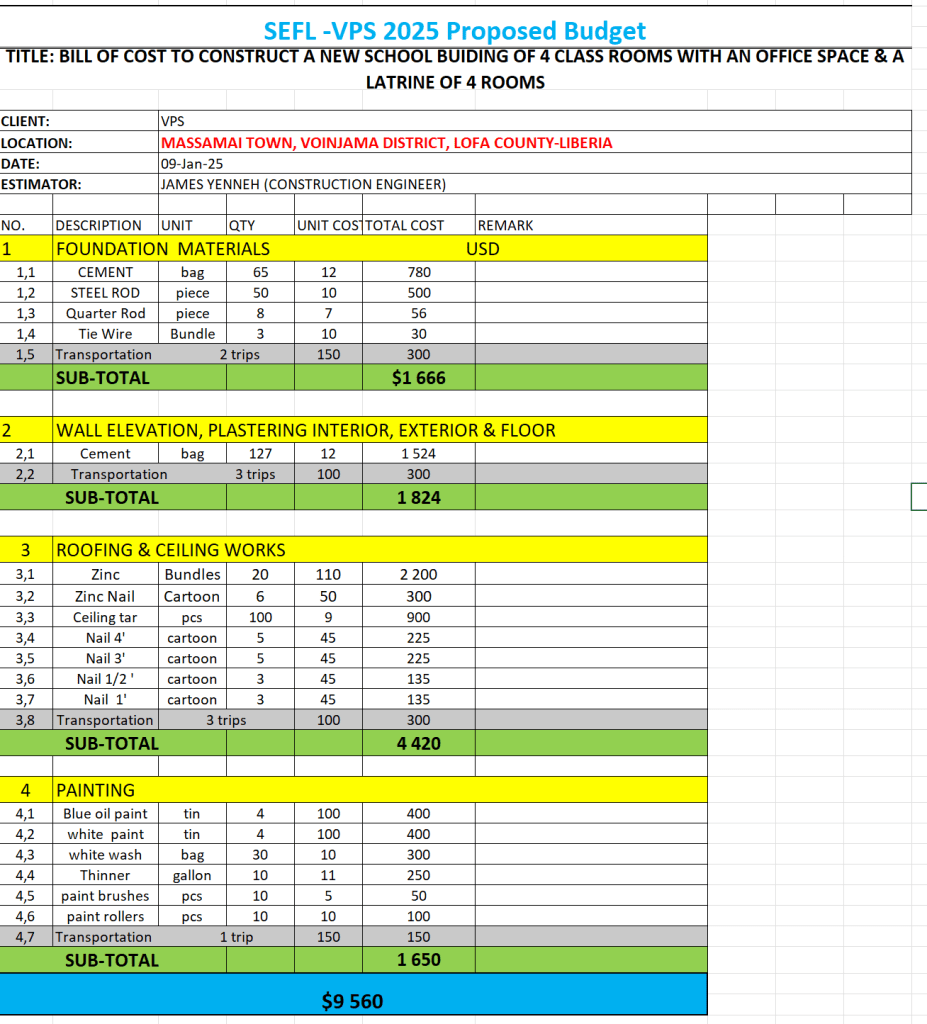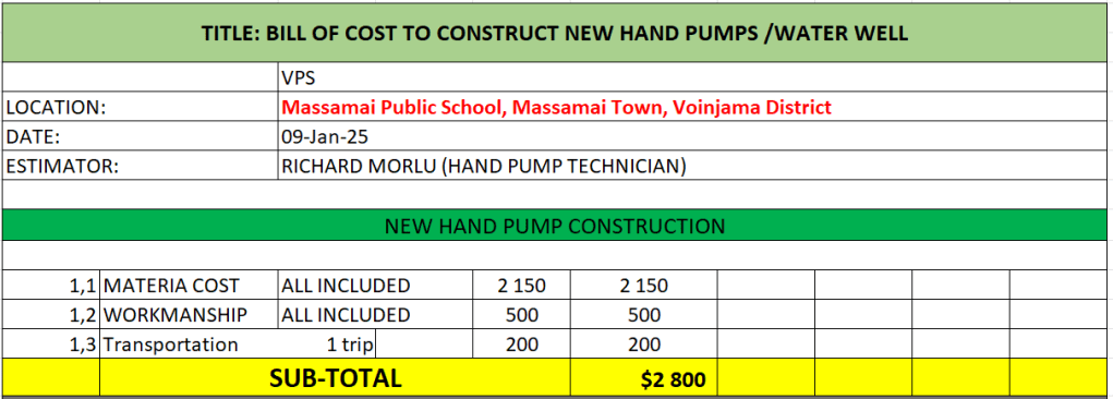 Och här är budgeten. Det tillkommer ca 15-20% för lokal projekt- och teknisk ledning på plats, som leder arbetet – där hela byn hjälper. Byn har även t ex ansvar för att stå för tegelstenar, sand och plankorna som behövs.