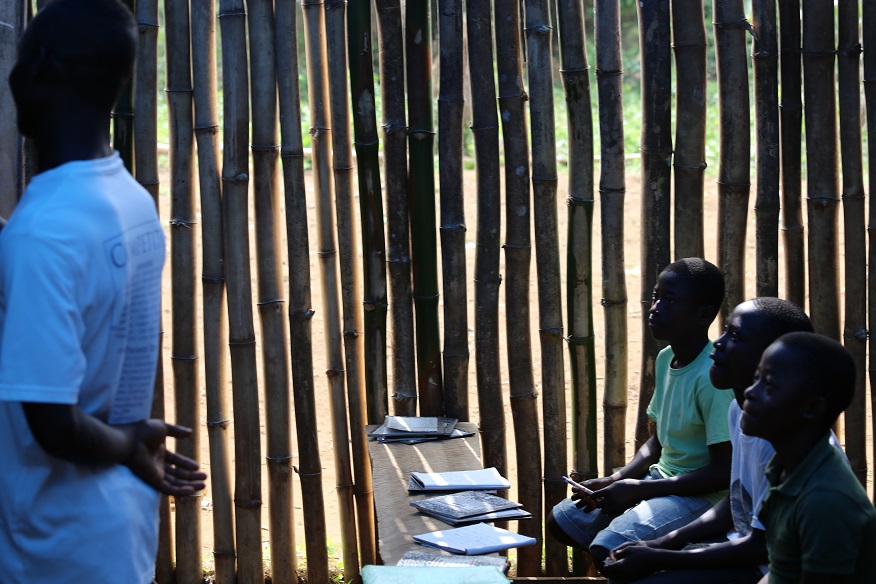 Skolan Mother Artis var inrymd i en kyrka. Tyvärr kunde inte skolan vara kvar där. Då fick de bygga en mycket enkel bambuskola på en tillfällig mark. Där gick det inte att driva vettig undervisning, varken under torrperioden och under regnperioden var det mest stängt. Bambuskolan såg ut så här när vi besökte den i Maj 2014. Läs mer om det besöket här.