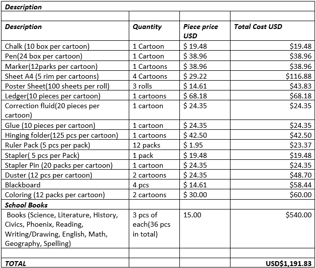 Skolan fick först under 2014 hjälp med skolmaterial – innan de blev utkörda ur kyrkan. Så här såg den budgeten ut som levererades efter att skolorna öppnades våren 2014 efter Ebolan.