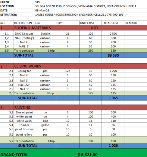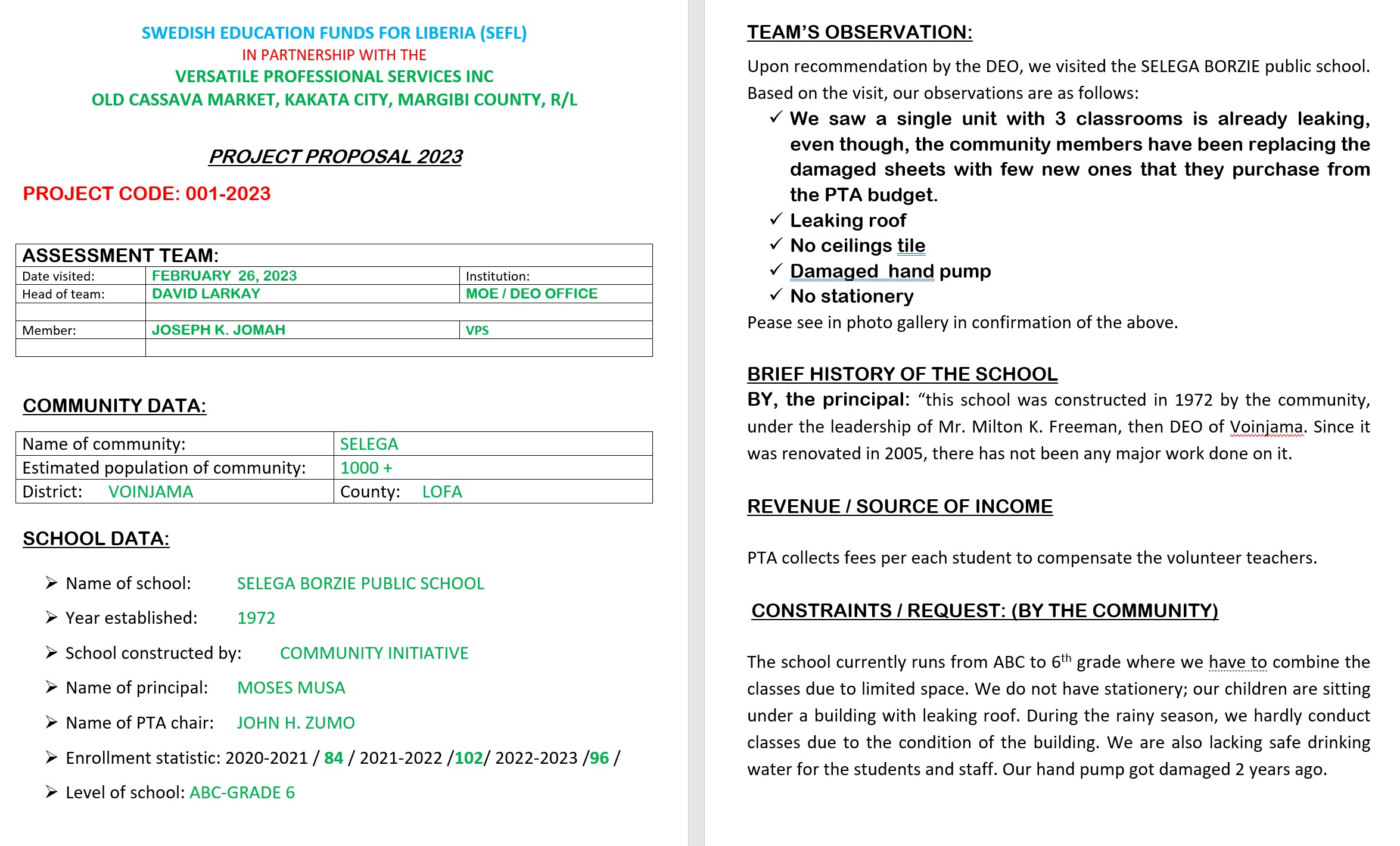 Så här skriver teamet som bekräftat behovet på plats, rektorn Moses Musa och lokala skolförvaltningen i Lofa: