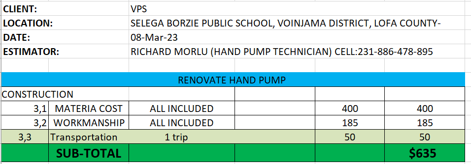 Budget enl nedan för att återställa till en fungerande skola och möjliggöra rent vatten med en reoverad brunn och handpump. Ca 20% tillkommer för lokala projekt- och tekniska ledningen