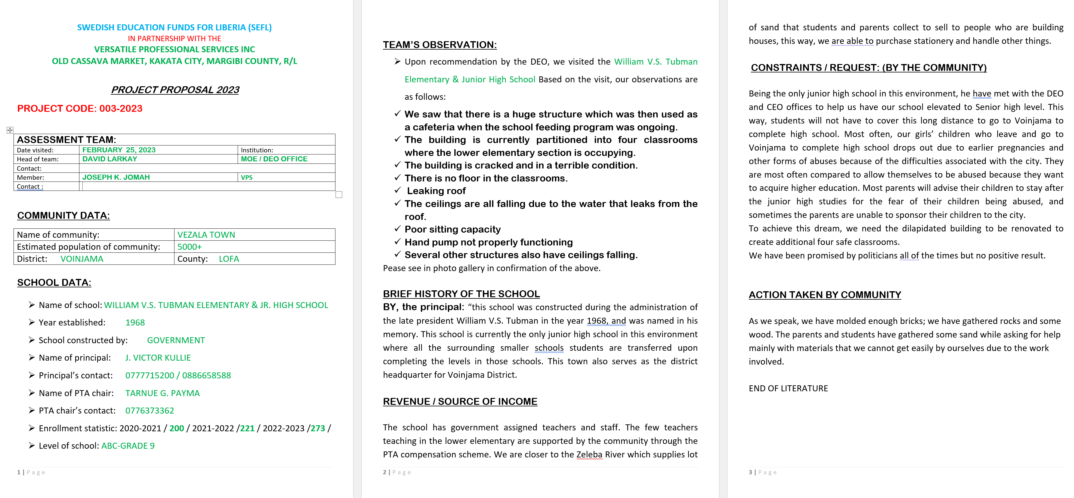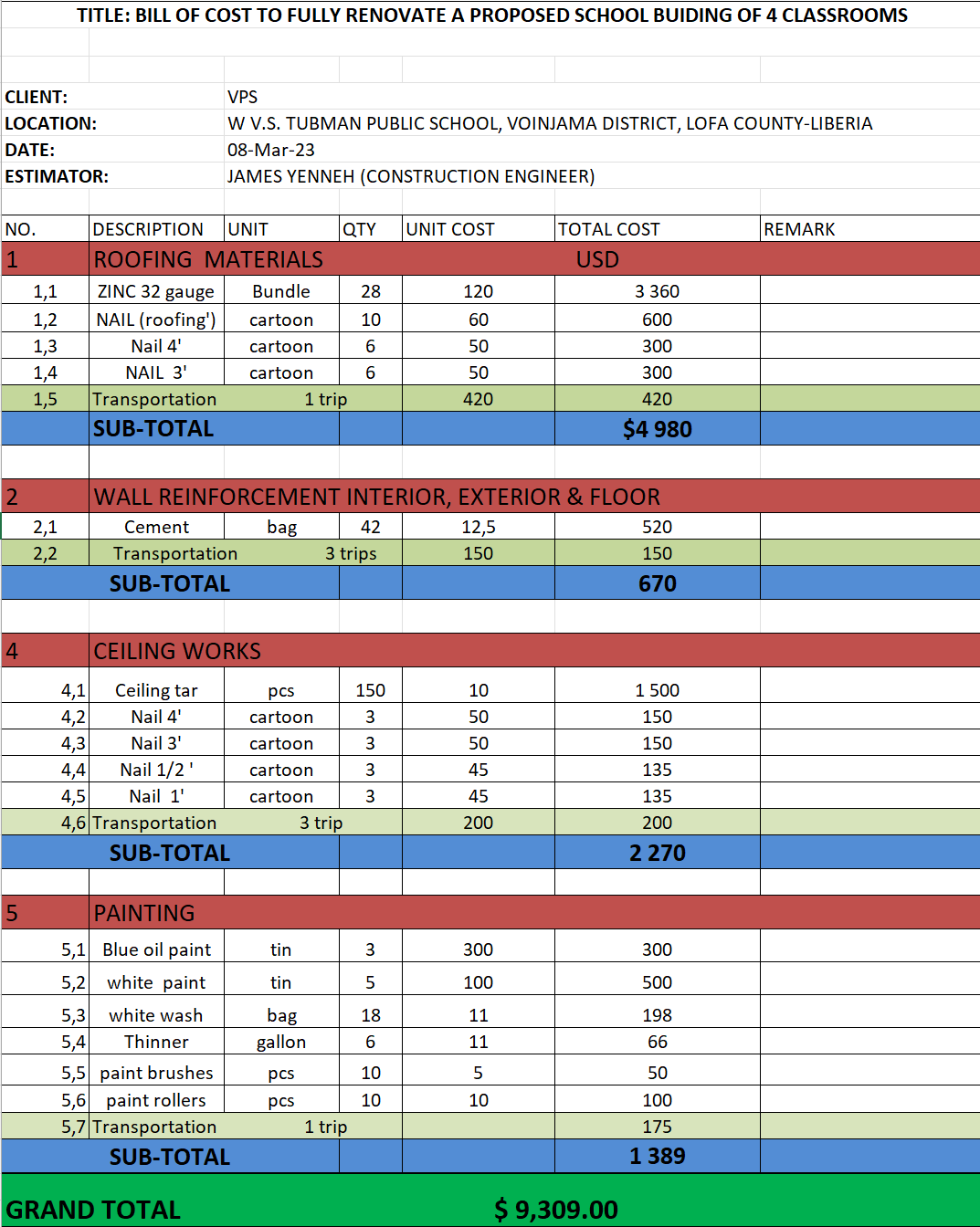 W.V.S. Tubman Public School är ett av de projekten. Med 4 st klassrum kan skolmiljön göras dräglig för 120+ elever. Byn är engagerad och redo att hugga i med arbetskraft. De har redan startat att fixa de material till bygget som de kan få fram själva. Vår lokala partner VPS koordinerar med projektledning, teknisk koordinering och inköp, samt transport av material. Budget finns längre ner i inlägget.