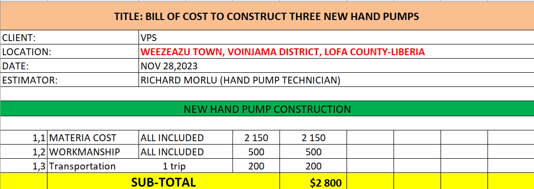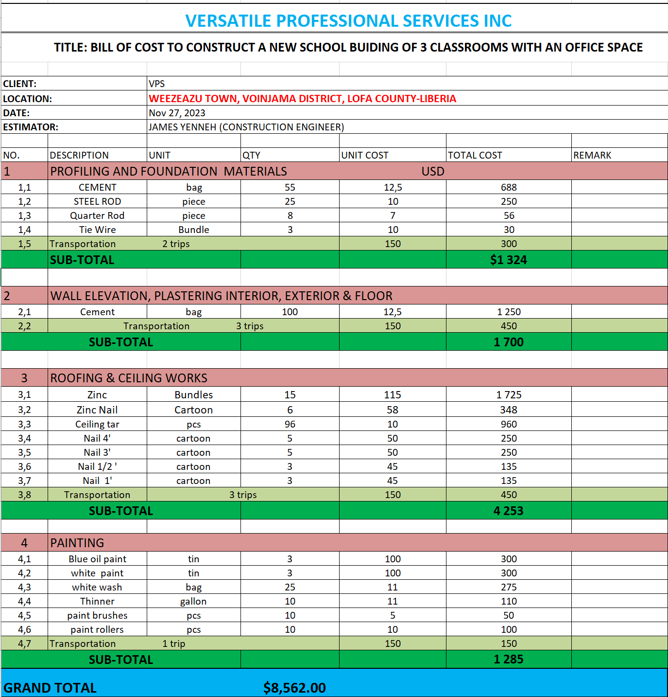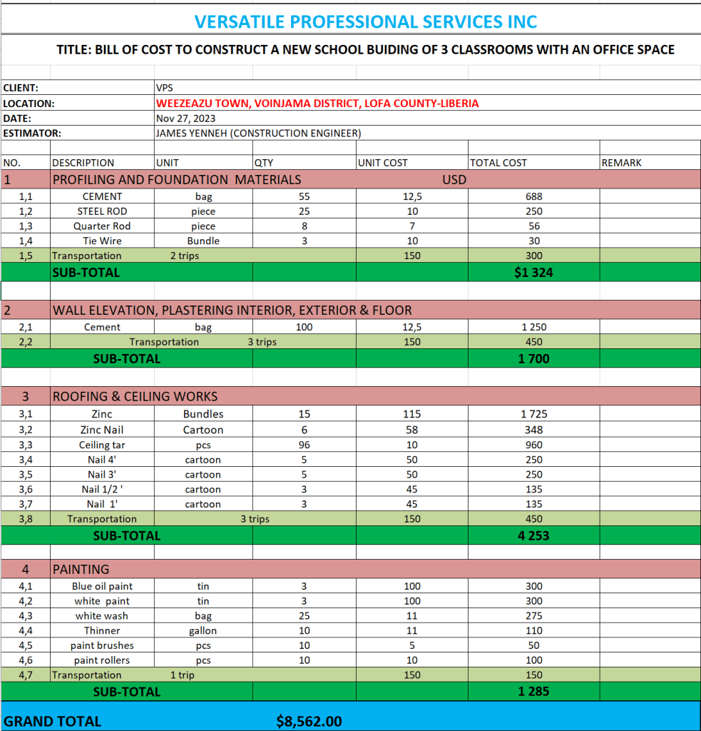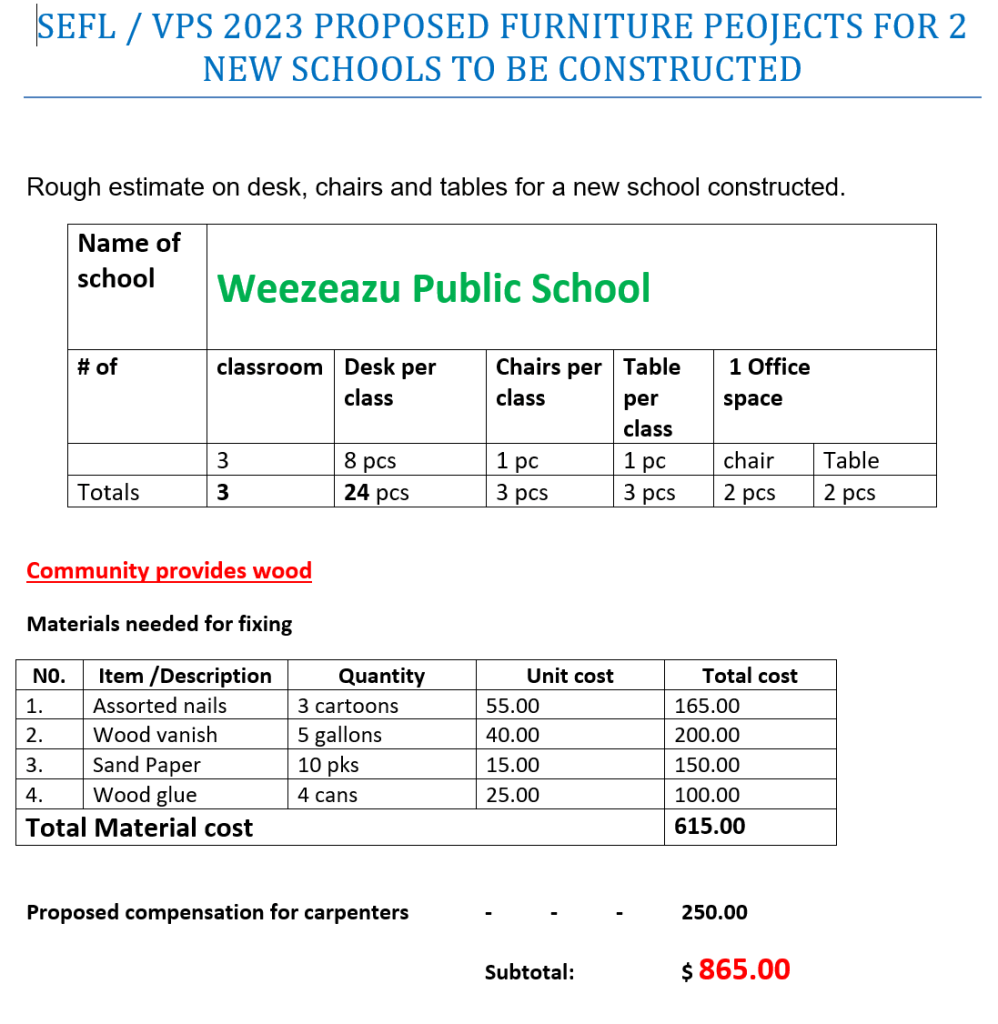 Budget enl nedan för skapa en fungerande skola, en vattenbrunn med pump och bygga lokalt producerade möbler. Ca 20% tillkommer för lokala projekt- och tekniska ledningen.