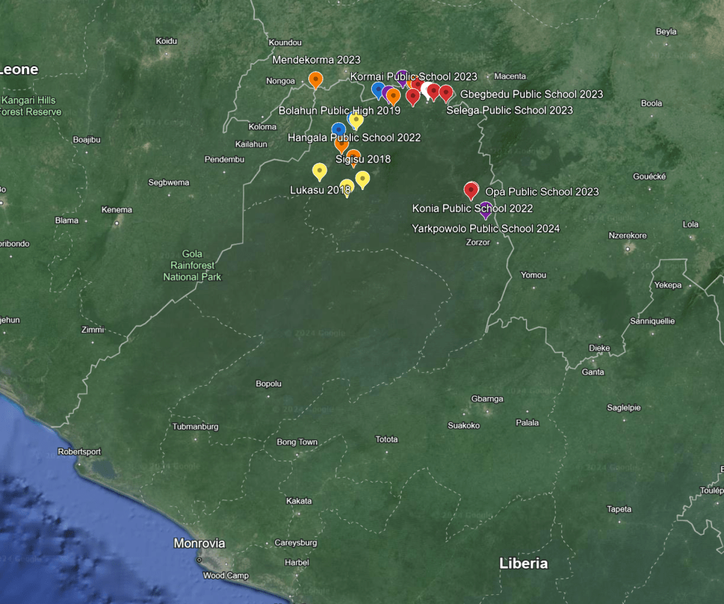Tillsammans med lokala skolmyndigheter fortsatte vi under hösten 2023 att identifiera de platser som är i störst behov av skolstöd. Byn Weezeazu har varit i princip isolerad till dess en enkel s k ”feeder road” byggdes nyligen. Med det öppnades möjligheten att bygga en skola där med. Några av eleverna som ser fram emot att få en skola byn !