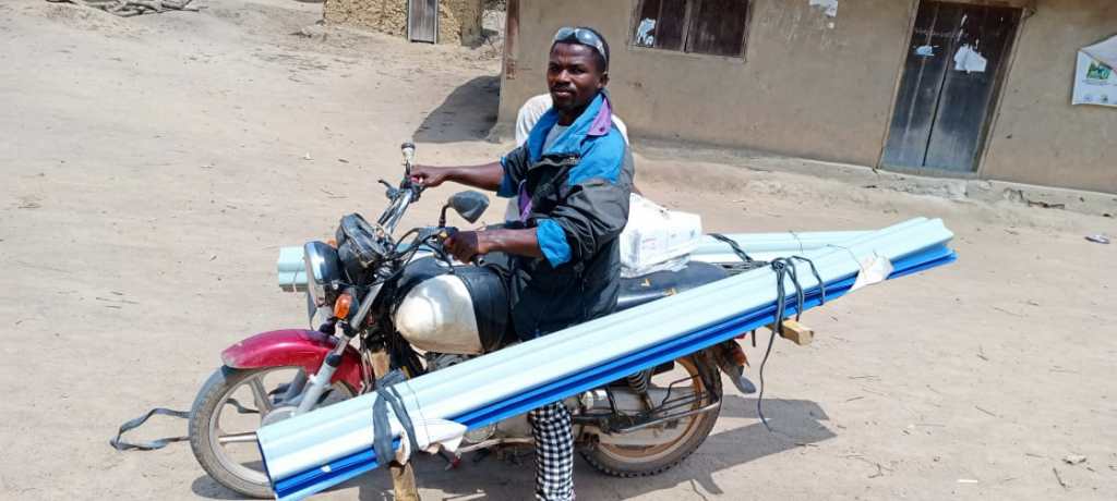 Transporter sköts till stor del med motorcykel. Här kommer en del av taket !